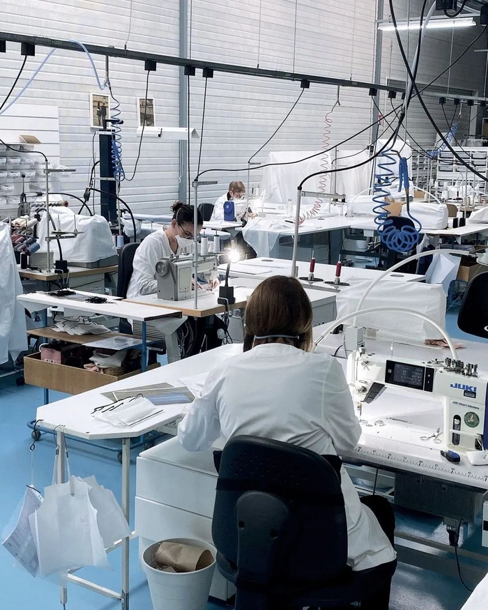 △ 始祖鸟防护服及生产线。图片来源 | dailyhive.com、blog.arcteryx.com/medical-gowns