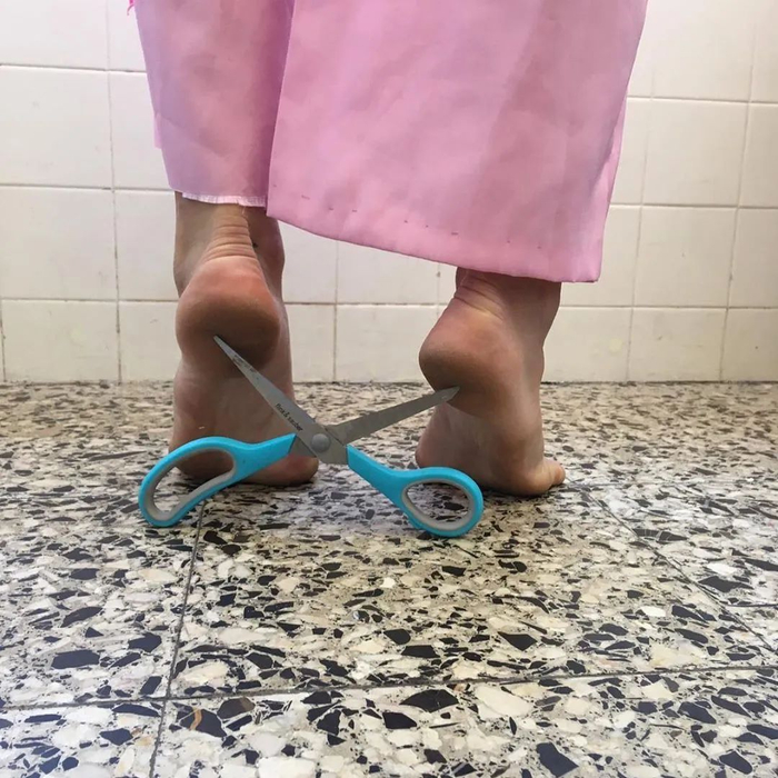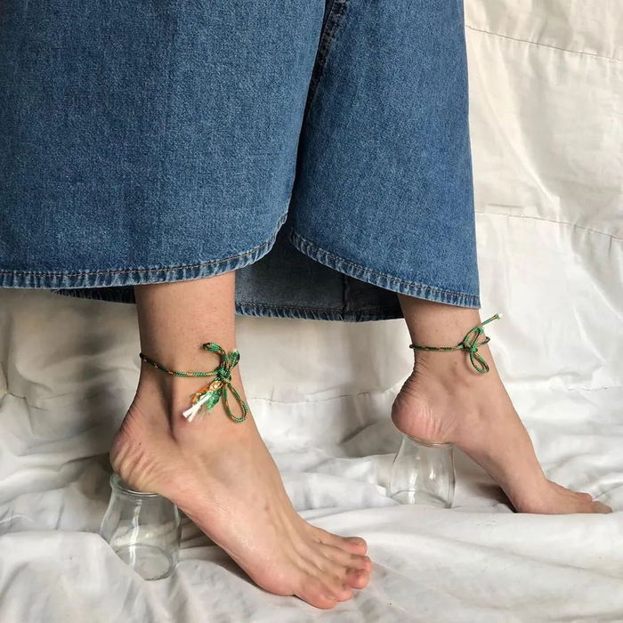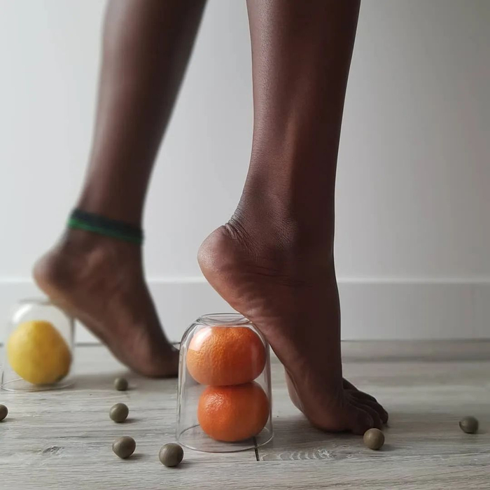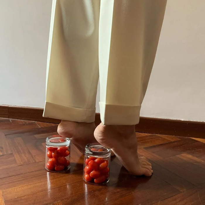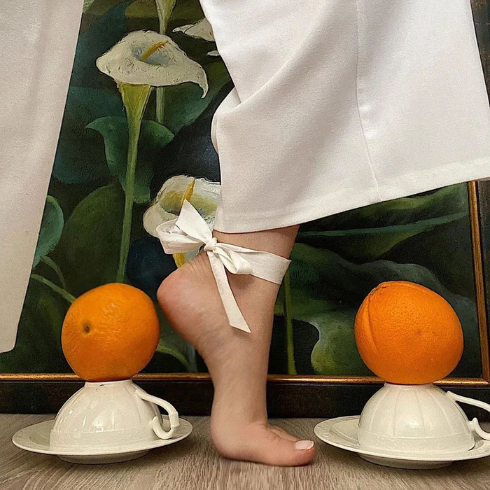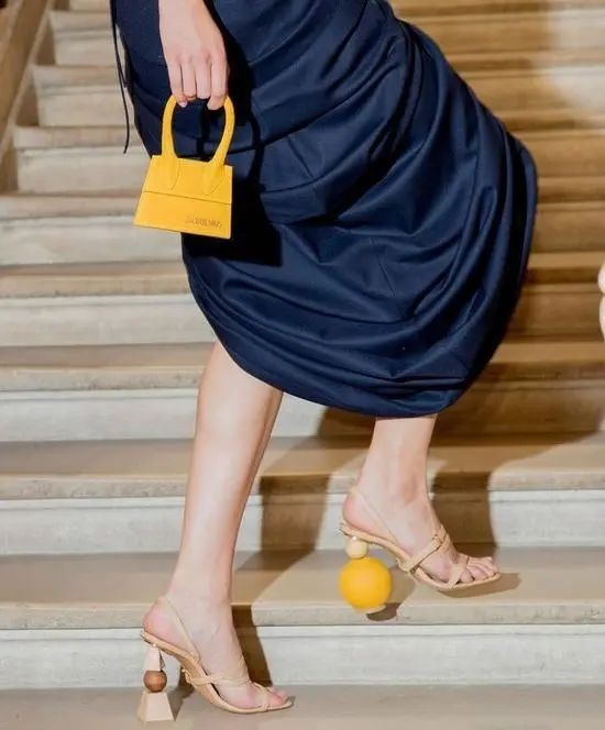 雅克慕斯在 Instagram 上发布一张图片。图中一双赤着脚的脚,踩在橙子和柠檬上,配图发起创意挑战 #jacquemusathome,鼓励关注者从日常物件里得到灵感,创造一双高跟鞋。这个挑战和品牌曾引起热议的“鸡蛋跟”“积木跟”高跟鞋不谋而合。