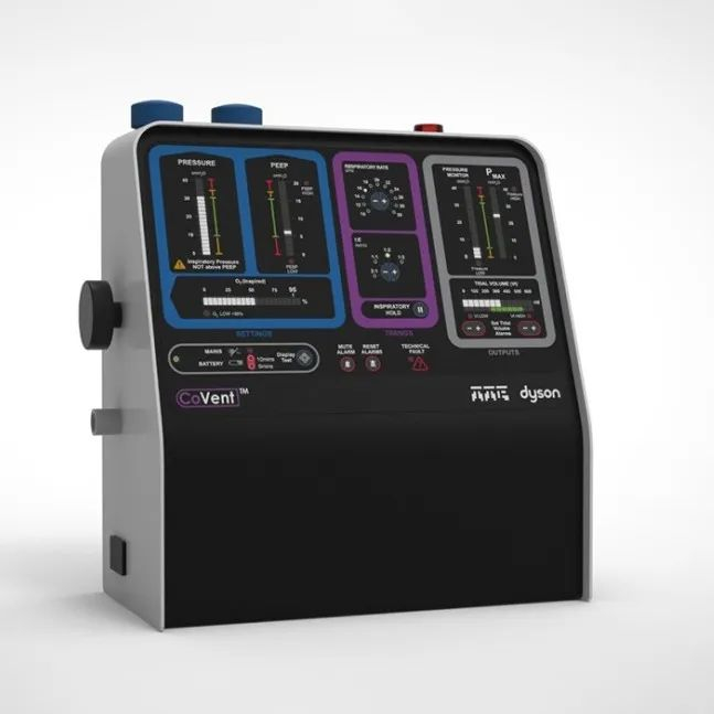 其后,英国电器品牌 Dyson 与工程公司 The Technology Partnership 合作,优化净化空气与电动马达技术,以满足临床需求,于十天内为新冠肺炎患者设计出一款病床型呼吸机“CoVent”。这是一种使用电池的便携式呼吸机,能够方便在搬运或临时医院里使用。英国国家卫生局(NHS)和 MHRA 参与了整个过程,目前正等待监管部门核准使用。