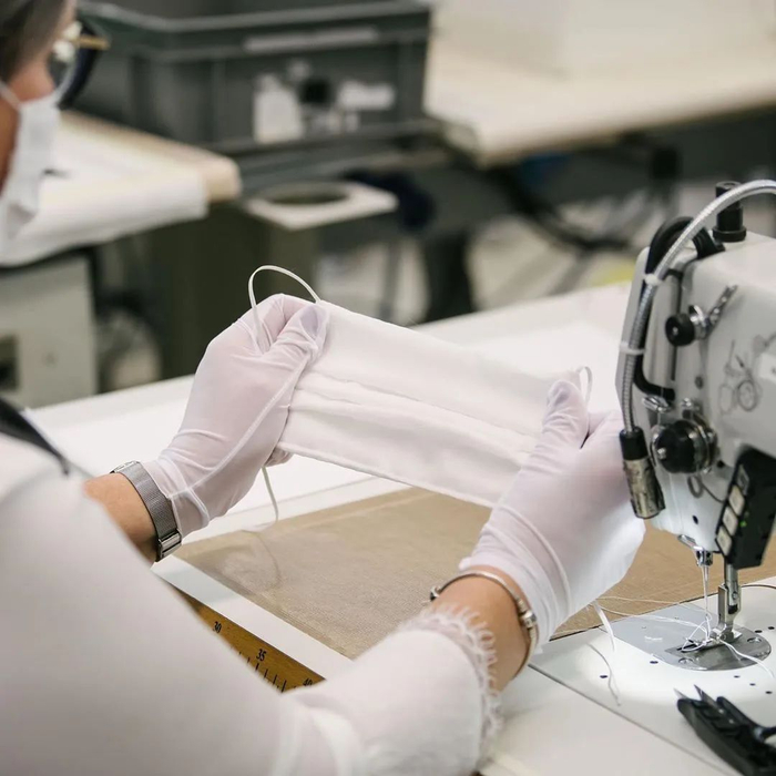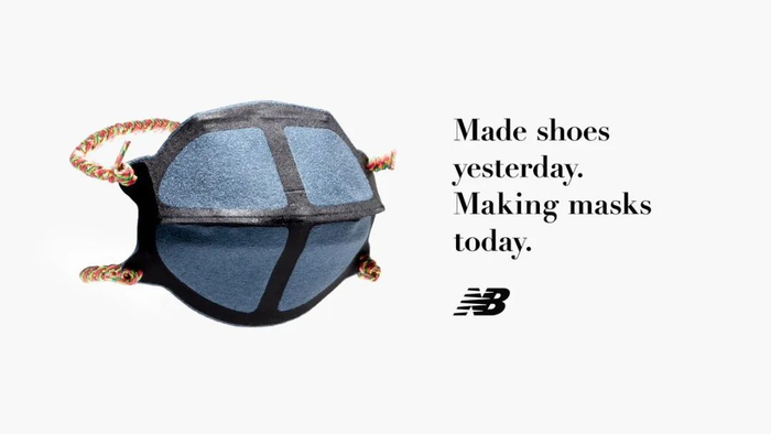 美国运动品牌 New Balance 打出“昨天做鞋,今天做口罩”口号,利用现有材料、改变工艺以制造口罩。此项目与相关院校及当地医疗机构合作,三天内原型设计完成,不到两周开始全面投产。 为了使人联想到品牌,New Balance 并没有将口罩设计成纯白色,反而更加“运动系”——蓝色底面、黑线条分割,彩色绑带点缀。