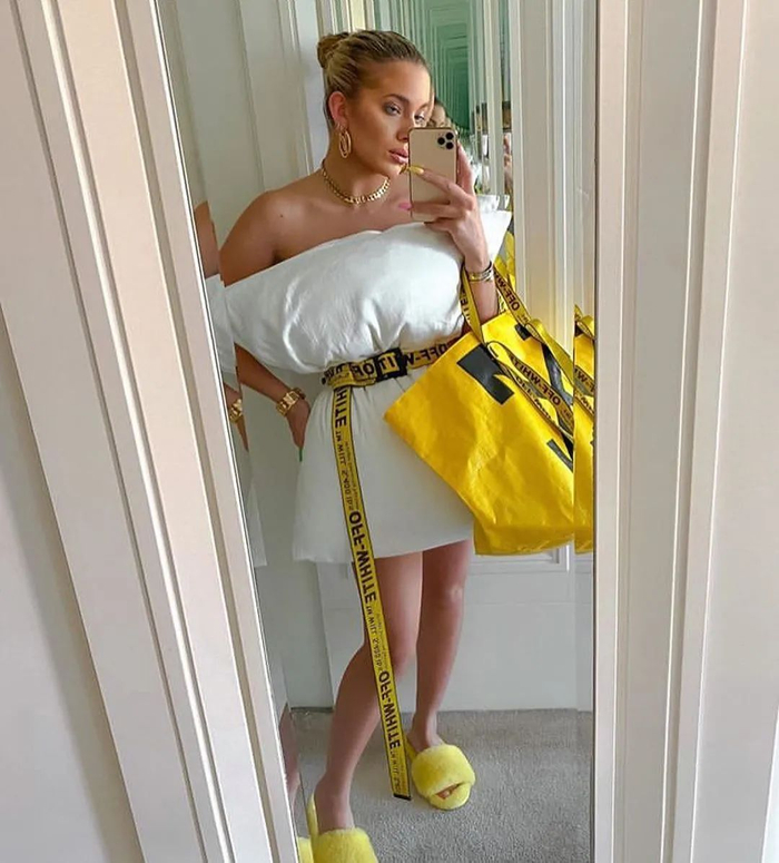 疫情期间,Instagram 流行起的枕头挑战(#pillowchallenge)吸引了很多人,参与者只身着一个枕头和一根皮带。而很会利用社交网络营销的意大利街头品牌 Off-White,直接从中选出系着品牌腰带的挑战作品,发布在官方 Instagram 上。