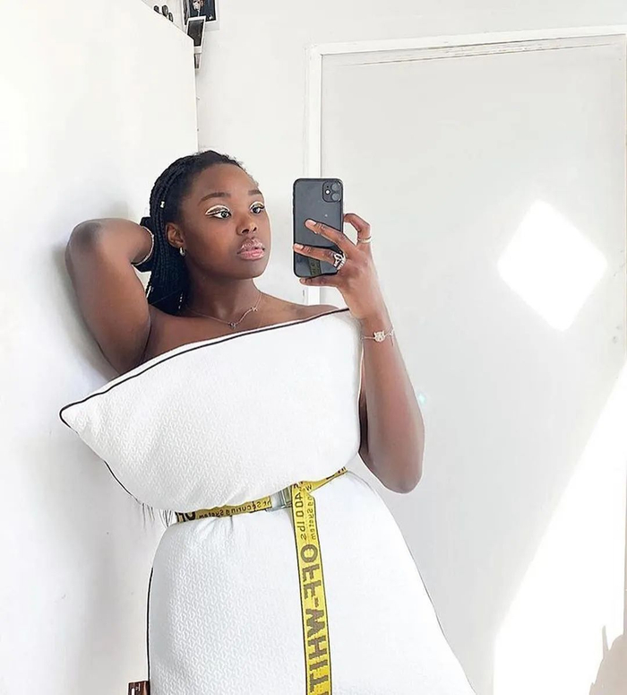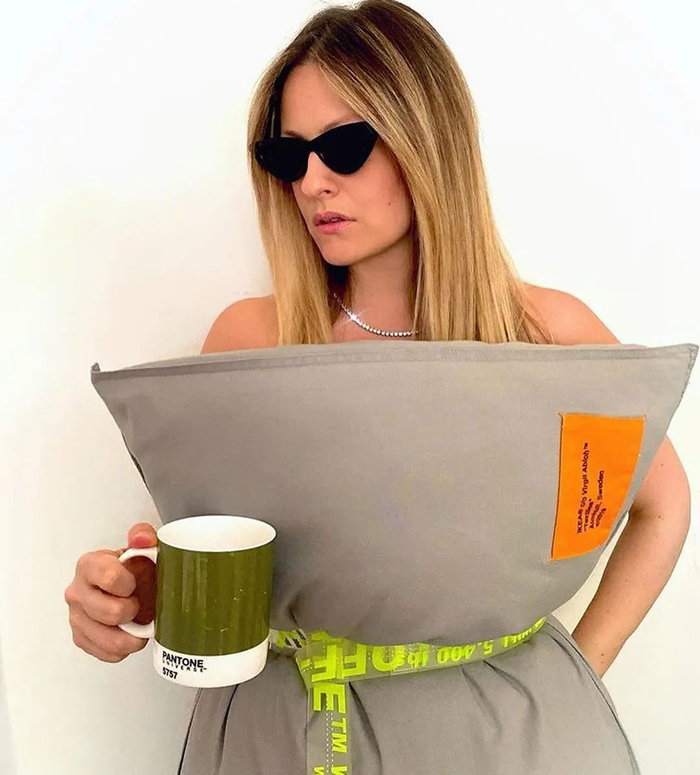 △ Off-White 官方分享的图片中,模特穿着维吉尔・阿伯拉赫与宜家(IKEA)合作的枕头及 Off-White 的腰带。截至 4 月 21 日,Instagram 上有超过 23 万条带有 #pillowchallenge 标签的帖子。图片来源 | Instagram