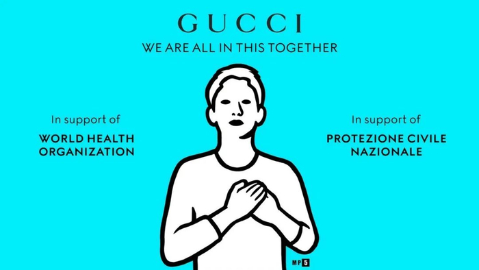 从 3 月底开始的两周时间里,Gucci 使用拥有超过 7000 万关注者的社交媒体账号,发布世界卫生组织(WHO)官方公共服务信息。此外,Gucci 倡议“We Are All In This Together”(我们同舟共济),发起两项筹款项目,其中一项可直接通过 Instagram Story 中的“捐款”功能捐赠。倡议海报由长期合作的视觉艺术家 MP5 创作,沿用 MP5 的黑白线条人物风格。