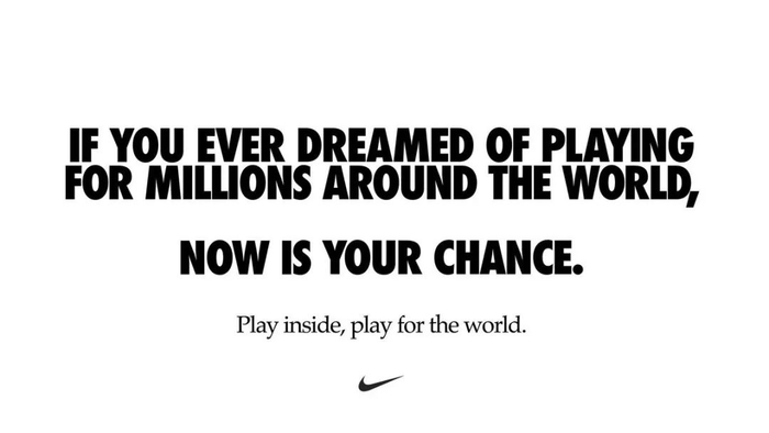 耐克发布纯文字海报,提出“在室内锻炼即可为世界效力”。海报由韦柯广告公司(Wieden + Kennedy ,W+K)制作。耐克同时宣布限时免费开放 Nike Training Club 的附加项目包,其中包括渐进式训练计划等。海报发出后,各招牌球星纷纷响应,发图与 #playfortheworld 互动。