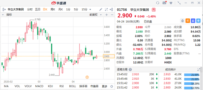 截至2020年2月29日止的6个月业绩为营业额3.94亿元人民币,增长15.9%。股东应占盈利同增长22.6%至1.38亿元人民币。期内整体毛利率增加1.6个百分点至57.4%。广东工业大学华立学院为广东省首批的民办独立学院之一。提供4至5年的本科课程,完成合格后可获颁由教育部认可的学士学位。设有30个专业共7个学系,包括机电及工程信息、城市建设、传媒与艺术设计、管理、会计、外语及经济等。