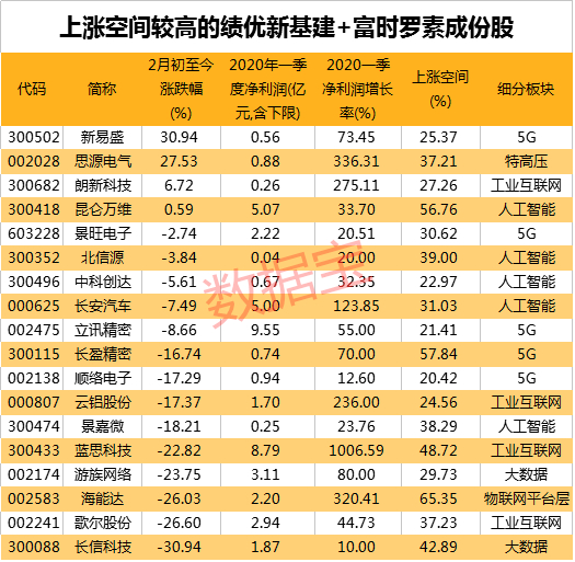 纳入富时罗素成份股业绩相对来说较为稳定,数据宝根据条件:富时罗素成份股,一季度净利润同比增幅超过10%(含预告下限),且机构一致预测目标价上涨空间超20%的新基建概念股仅有18只。