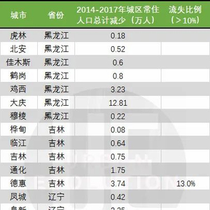 2018年,有10座城市仍在持续收缩,城区常住人口连续第四年下降。其中,5座分布在黑龙江,3座在辽宁,1座在吉林,1座在内蒙古。