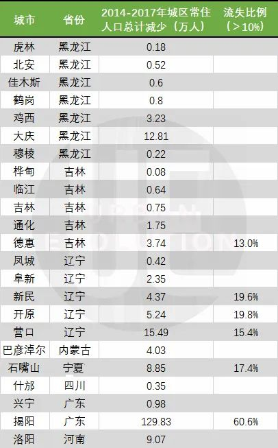 从城区常住人口流失率来看,2014年至2018年,辽宁新民和开原两座城市超过20%,内蒙古巴彦淖尔亦逼近10%。