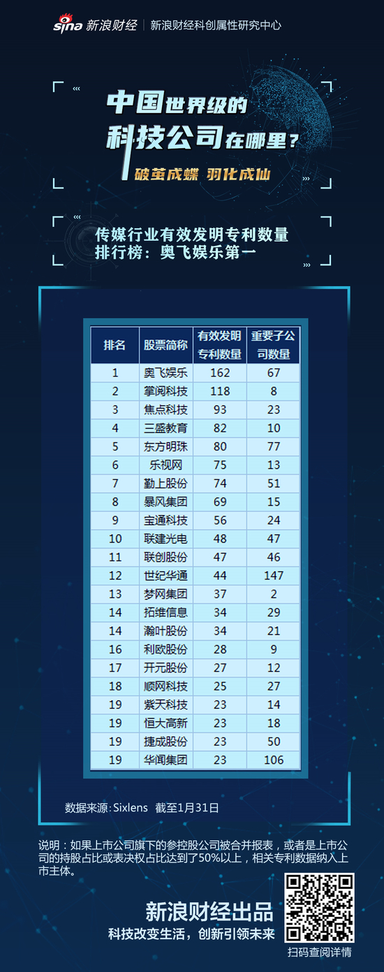 传媒行业有效发明专利排行榜:奥飞娱乐第一