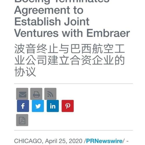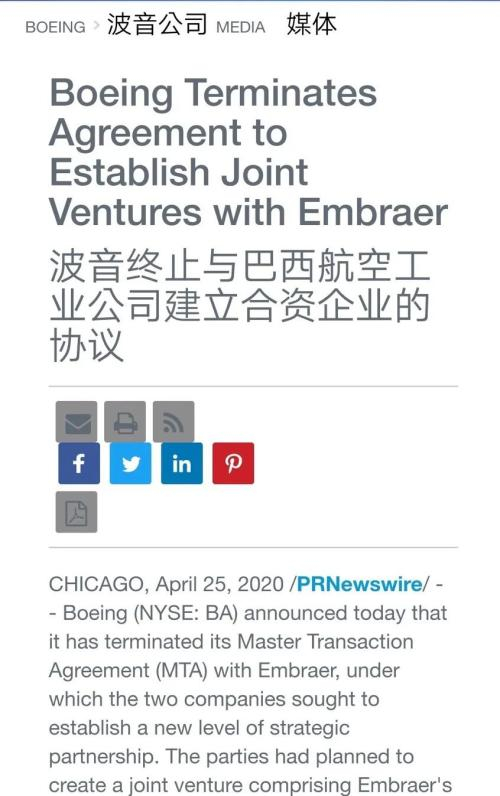 据飞行国际报道,当地时间4月25日,波音公司宣布,因双方预计在新冠病毒疫情打击下飞机市场将大幅萎缩,正式放弃与巴西航空工业公司(Embraer SA)价值42亿美元(折合约297.4亿元人民币)的商用飞机业务合并计划。
