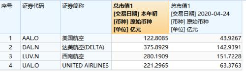 截至4月24日,今年以来美国航空公司集团、达美航空公司、西南航空公司和联合航空公司的股价分别下跌63.92%、61.41%、45.46%和70.98%,损失都很严重,市值共计蒸发大约598.2亿美元(折合人民币4236亿元)。