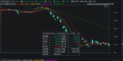 美东时间4月24日,波音股价大跌6.36%,报128.98美元/股。截至美东时间4月24日,2020年内波音股价累计暴跌60.17%。