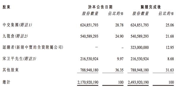 绿城中国已发行总股份数约为21.71亿股,主要股东为中交集团、九龙仓、宋为平等。此次引入新湖中宝,将通过配发新股份的方式,交易完成后,绿城中国总股本也将增加到约24.94亿股。