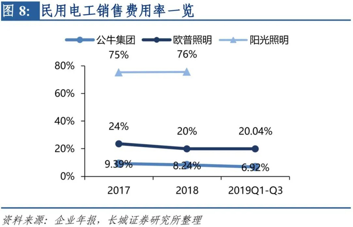 店招投放为其缩减销售费用投入,公牛的销售费用率业内最低,店招背后的提货及排他协议贡献增长确定性。19年前三季度,公牛的销售费用率约为6.92%,远低于其竞争对手,店招带来的广告及销售效果较优。公牛对商家的店招投放并非全部免费,而是按照完成销售量的时间进行不同比重的报销,最高可达费用的90%,这种方式提高了商家售卖公牛产品的积极性。与晨光相似,公牛品牌的也与其终端渠道签订排他性协议,分别从转换器、数码配件及墙壁开关插座渠道对商户在经营同质化产品时有所限制。