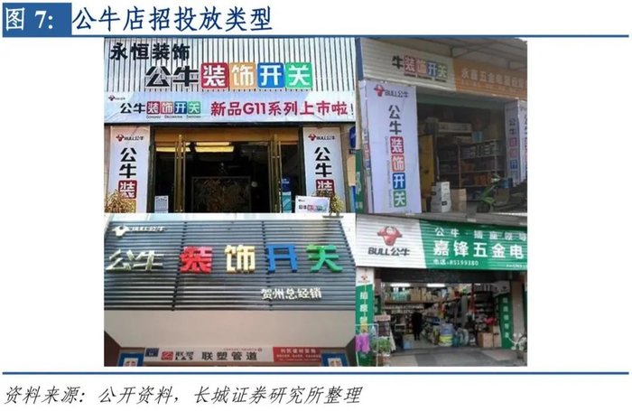 店招投放超80万家,占销售终端总数的80%。公牛经历初期研发普及转化器、开关、插座后又转战LED照明领域及数码配件领域。凭借多年以销售为核心的品牌传播模式和持续的门头招牌投放,目前公牛线下店招总投放量已达到80余万,其中五金店占最大比重约为74万家。2010年至2013年,公牛连续三年进行累计20万个店招的大规模投放,有效将“BULL公牛”、“公牛装饰开关”、“公牛安全插座”、“插座专家与领导者”的品牌形象打入终端市场。凭借其线下渠道及经销模式布局良好,目前已覆盖31个省市及自治区的销售网络,建立了超过100万家的销售终端,约80%的线下渠道都使用公牛的店招,品牌传播到位。
