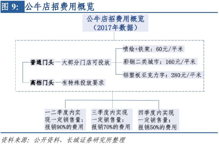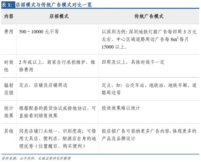 店招模式投入费用成本较低,可有效提升品牌的知名度。品牌店招的模式为品牌商为店铺免费更换店铺招牌(500~10000元左右),但店招上必须有品牌的露出,可以理解为店招就是品牌的广告宣传牌,同时也彰显出品牌的实力,有较好的广告宣传效果。而对于店铺主而言,店招和展示柜的投入较大,免费店招的诱惑力不小,但获得免费店招也需要作出相应的努力,如对于品牌的提货额或者排他性作出一定承诺。相比传统广告模式,店招策略成本低、辐射范围大且时效性相对持久,同时在双方合同的制约下对销售额的提升有明显且直观的效果。
