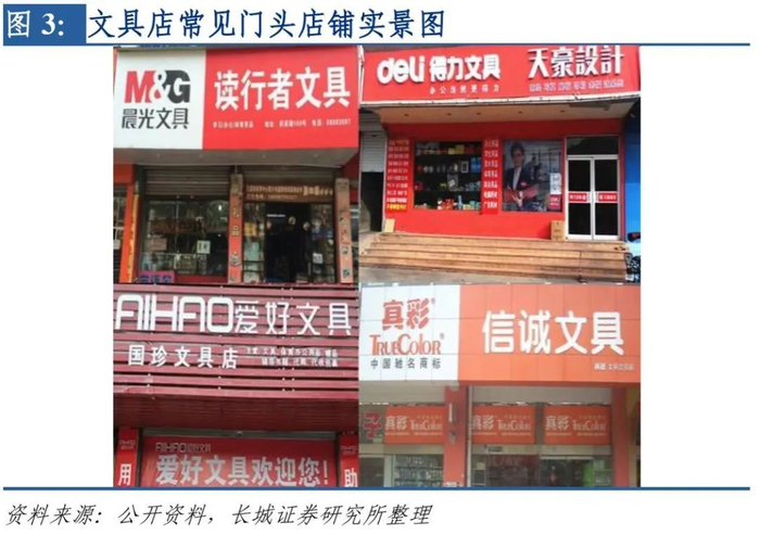 竞争对手的店招数量不及晨光。根据草根调研,真彩文具早年也在销售端渠道为个体户门店设置门头,但由于其未要求销售端只能在店内销售真彩产品,导致店内进货渠道日渐复杂,近两年来门头逐渐消失,从而失去店招模式带来的渠道优势。与此同时得力文具积极设置门头,在过去的两到三年全国合计新增门头数约1000余家,渠道广度及店招扩张速度均不及晨光。