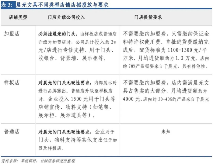 店招背后的汰换系统支撑提货额,品牌份额持续提升。晨光的加盟店必须挂有晨光品牌的门头,同时签订排他性协议,要求文具类产品在店内销售占比至少70%。每年都会约1000+以上的普通店及样板店升级为加盟店,门店升级战略也不断拉高公司销售额。与此同时,对于依旧挂着晨光门头但已经卖其他产品的店铺,在新的一轮渠道更新中也会被优质门店逐渐淘汰。