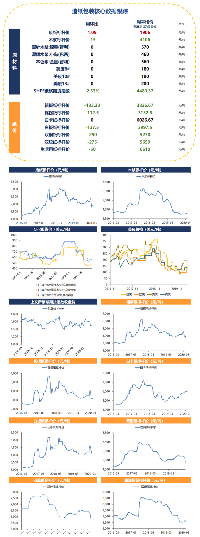 文化纸供需压力增大,箱板瓦楞纸延续弱势。文化纸:文化纸近期价格快速下跌,截至4月24日,双胶纸较年初高位下跌800元至5650元/吨;双铜纸较年初下跌超700元至5270元/吨。国内需求较弱对铜版纸下游杂志、宣传册等需求造成影响,部分纸厂铜版纸转产双胶纸以期稳定价格。而双胶纸方面,海外疫情发酵对海外文化纸需求造成较大冲击,因此部分产品出口转内销。铜版纸转产及出口转内销共同作用于供给端,而需求端教材出版需求不旺,供需关系压力转大。文化纸盈利水平快速下降,双胶纸/双铜纸吨毛利分别下跌至588元/248元,预计中小纸厂铜版纸已处于微利状态。若该行情延续,文化纸或迎来新一轮产能出清。箱板瓦楞纸:本周,箱板纸价格下跌约133元至3826.67元/吨,瓦楞纸价格下跌110元至3132.5元/吨,废纸价格基本持平。供给方面,前期停机检修纸机陆续恢复,开工率上行;需求方面暂未见好转迹象,供需压力继续加大。