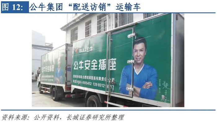 产品品质和品牌口碑是建立渠道信心的基石。从产品品质来看,公牛供货体系完善,提供销售培训。2009年公牛开拓了新的线下销售模式,即以“配送访销”策略进行线下渠道服务。该模式主要包括为各地经销商提供专用车辆进行配送货及拜访销售服务,且为经销商提供专业的培训服务促进其产品销售。该模式将中游制造业与服务业进行结合,为终端商家提供了业内同质产品无法提供的全方位服务,从而与商家实现绑定与连结占领了终端渠道市场。