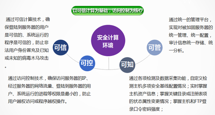 “可信”即以可信认证为基础,构建一个可信的业务系统执行环境,即用户、平台、程序都是可信的,确保用户无法被冒充、病毒无法执行、入侵行为无法成功。可信的环境保证业务系统永远都按照设计预期的方式执行,不会出现非预期的流程,从而保障了业务系统安全可信。