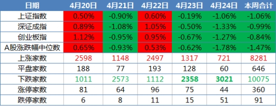 截至4月24日收盘,本周上证指数、深证成指、创业板指分别跌1.06%、0.99%、0.84%,5个交易日呈窄幅震荡走势,整体跌幅并不大,但个股则不然了。个股中位数则一定程度上反应了大多数个股真实的涨跌情况,指数则更多受成分股中“大块头”权重股的影响,这也是投资者感觉指数不跌个股跌的原因。