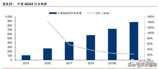 ADAS 产品渗透率有望迅速提升,市场空间广阔。根据《汽车产业中长期发展规划》, 到 2020 年,汽车驾驶辅助、部分自动驾驶、有条件自动驾驶,新车装配率超过 50%,网 联式驾驶辅助系统装配率达到 10%,满足智慧交通城市建设需求。中汽协 2017 年预计未 来随着系统成本的下降,ADAS 产品将全面渗透低端车型。至 2020 年,ADAS 系统的总 渗透率预计可达到50%,新车装配率有望达到100%。随着高级自动驾驶辅助功能的增加, ADAS 系统单车价值量有望提升。根据中汽协测算,2018 年中国 ADAS 行业的市场规模 大约 576 亿元,2019、2020 年增速有望达到 25%、22%,市场规模分别为 720、878 亿 元。