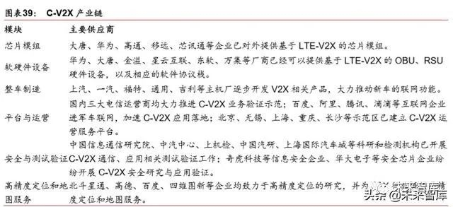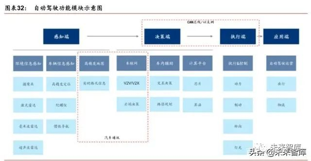 自动驾驶的产业链分为感知、决策、执行三个系统。其中感知分为环境信息感知、车辆信 息感知、高精度地图,其中最主要的零部件有摄像头、激光雷达、毫米波雷达、超声波雷 达;车辆信息感知包括高精度定位、陀螺仪、惯性导航;车辆需要通过高精度地图来获取 实时路况信息。在决策端,需要车辆网、车内辅助和计算平台的配合。车联网又包括 V2X、 V2V(车辆环境通讯和车与车通讯);车内辅助包括交互决策、路径规划;计算平台核心 要素是芯片与算法。执行端包括执行和控制,主要有动力、制动、转向、灯光四个方面。在应用端,自动驾驶运营主要有两个方面出行和物流。车企主要掌握了决策端的算法、执 行端,国内主要车企(上汽、长安、吉利、一汽、长城、广汽等)都有自己的出行公司, 布局未来自动驾驶汽车的应用。