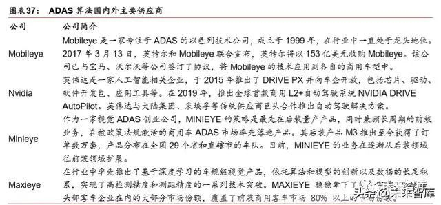 算法属于 ADAS 处理单元,主要针对传感器收集的数据进行分析并且发出相应的控制指 令,是 ADAS 系统的关键性因素。ADAS 可以按照技术分为辅助预警类和控制辅助类两 大部分,共包括 18 个子分类,每一种 ADAS 技术都对算法有着不同的要求。ADAS 算法 的外资供应商有英特尔(Mobileye)、 Nvidia、Mineye、Maxieye Tech、德尔福等,上汽、 长安、长城等车企也有自主研发。