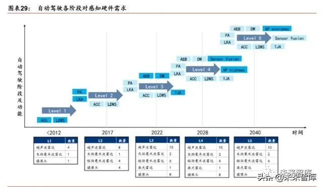从 ADAS 到自动驾驶,感知领域硬件需求增加,达到 L3 级别后单车感知硬件需求趋于稳 定。L1 级别需要 4 个超声波雷达、1 个长距毫米波雷达、1 个摄像头;L2 级别需要 8 个 超声波雷达、1 个长距毫米波雷达、4 个短距毫米波雷达、4 个摄像头;L3 级别需要 10 个超声波雷达、2 个长距毫米波雷达、6 个短距毫米波雷达、1 个激光雷达、8 个摄像头;L4 级别需要 10 个超声波雷达、2 个长距毫米波雷达、6 个短距毫米波雷达、1 个激光雷 达、8 个摄像头;L5 级别需要 10 个超声波雷达、2 个长距毫米波雷达、6 个短距毫米波 雷达、1 个激光雷达、11 个摄像头。