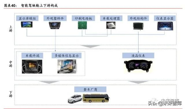 智能驾驶舱全产业链包括上游二级供应商、中游一级供应商和下游主机厂(前装)、4S 店 (后装)。上游主要是二级供应商,主要供应的硬件是显示屏模组、外观塑料件、印刷电 路板、处理器芯片、外观结构件、仪表显示器等产品,主要供应的软件包括车机操作系统、 车机应用。中游是一级供应商,负责组装和安装软件调试,车载中控娱乐、多媒体信息显 示、液晶仪表、流媒体后视镜、HUD 等系统。下游主要是前装的整车厂家,后装市场的 维修保养网点。