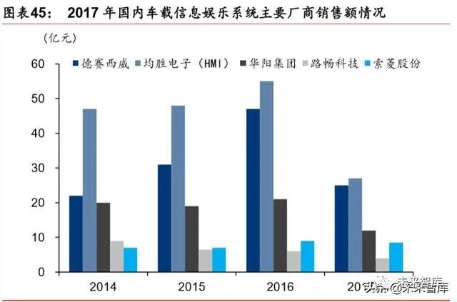 智能驾驶舱国内外供应商较多,国内供应商有望依靠成本优势实现国产替代。根据中汽汽 车电子电器信息数据,2015 年全球车载信息娱乐系统的供应商分别为哈曼、阿尔派、博 世、三菱电机、电装,前五大厂商的市场份额合计为 46%,其中哈曼以 13%的市场份额 位居首位。2017 年国内车载娱乐系统的主要厂商有德赛西威、均胜电子、华阳集团、索 菱股份、路畅科技等。
