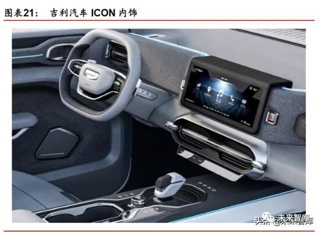 吉利在智能驾驶领域最新的代表车型是 ICON。搭载行业领先的 L2 级智能驾驶系统,有 12 颗超声波雷达+1 颗毫米波雷达+5 高清摄像头,能实现 ICC 智能领航、AEB 城市预碰 撞、LKA 车道保持等辅助驾驶功能,为用户提供一个既能轻松操作,又能弥补操作失误的 安全行车环境。在此基础上,ICON 更是进行一系列的安全科技升级。比如将行车记录仪 升级为四向 360°行车记录仪,实现前后左右四个方向的影像显示,同时对车速、转向、灯 光、主驾安全带等 11 项驾驶信息进。特色:第一、540°全景透视影像功能。通过 4 颗高 清广角摄像头,吉利 ICON 不仅能提供周身 360 度影像,还能将车底的情况尽收眼底。第 二、可在 0-150km/h 范围内,支持自动跟停、自动跟走、过弯辅助的 ICC 智能领航系统。