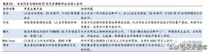 长安汽车“北斗天枢”计划。2018 年 8 月,长安汽车发布智能化战略——“北斗天枢” 计划,旨在从传统汽车制造企业向智能出行科技公司转型,并宣布从 2020 年起不再生产 非联网新车。“北斗天枢”计划以“4+1”行动计划为牵引,4 个计划分别是“知音伙伴计 划”、“合作共创计划”、“智能体验行动”、“智能联盟行动”以及 1 个“千人千亿计划”。“知 音伙伴计划”主要是建成个性化定制的“汽车平台”和服务。“合作共创行动”主要是与 腾讯、华为、科大讯飞等开展合作,构建智能汽车产业联盟,提升智能出行伴侣“小安” 的交互能力。2020 年前,建成 L3 级自动驾驶智能开放平台,2025 年,建成 L4 级自动驾 驶的智能开放平台。“智能体验行动”主要是提供极致出行体验,2020 年 100%新产品联 网,100%搭载驾驶辅助系统。