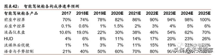 我们预计国内智能驾驶舱2025年市场空间有望突破1000亿元, 2021-2025复合增速15%。由于疫情影响,我们预计国内乘用车行业 2020 年销量同比-5%。我国千人保有量与发达 国家相比仍有较大差距,随着经济复苏,乘用车销量也有望稳步复苏,预计 2021-2025 年维持 3%的稳定增速(后文市场空间测算均采用此假设)。根据高工产业研究院数据, 2017 年智能驾驶舱六大构成前座中控屏、后座中控屏、液晶仪表盘、HUD(抬头显示)、 流媒体后视镜、语音控制单车价值量分别为 1450、1450、4000、2000、1000、300 元, 渗透率分别为 70%、0.1%、10.6%、4%、1%、21%。由于中控屏大屏化趋势和整合导航 等因素,我们预计 2020 年单车价值量提升至 1550 元,后续年降压力会抵消大屏化趋势 带来的影响,价格趋于稳定。液晶仪表盘渗透率有望快速提升,由于单车价值量较大,后 续可能有降价压力。HUD 由于安全性等考虑渗透率提升速度慢于液晶仪表盘。语音控制 渗透率有望逐步提升,逐渐成为标配。因为实用性相对弱于液晶仪表盘,流媒体后视镜渗 透率有望稳步提升,但提升速度慢于液晶仪表盘。