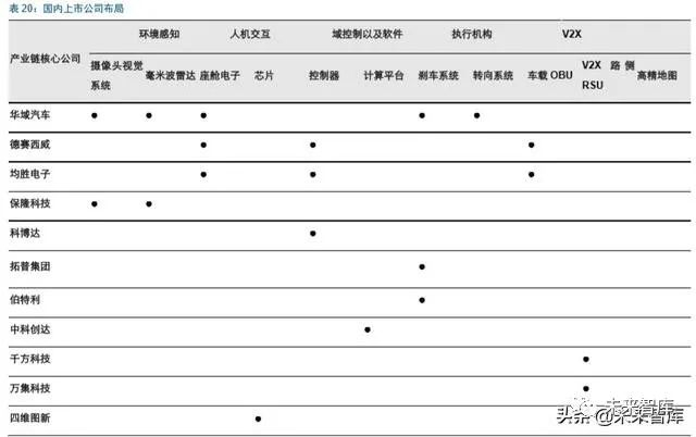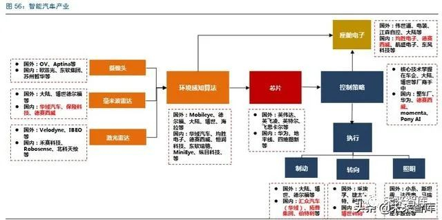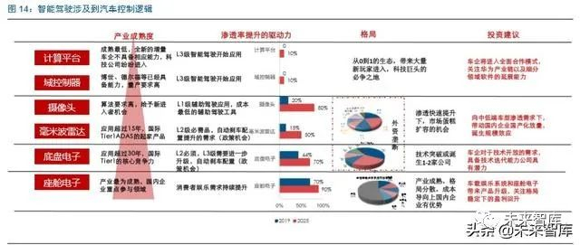 各个核心部件的产业成熟度不同,对应产业的投资逻辑也有所差异,最关键是如何找到 国内企业在不同环节下的突破机会。智能汽车的产业环节如毫米波雷达、底盘电子等是 国际 Tier1 储备较为深厚的领域,持续处于垄断阶段。座舱电子壁垒相对下降,国内企 业已经深度参与。摄像头对算法要求较高,Mobileye 对于汽车行业也是新进入者。计算 平台和域控制作为 L3 级的新增市场,目前仍处于空白。目前不同环节产业的成熟度不 同,对应国内公司的机遇也有所不同。我们认为:1)计算平台和控制器:车企和供应商 将进入全面合作模式,关注华为产业链以及细分领域软件的延展能力;2)传感器:向 中低端车型渗透带动国内企业国产化放量,产生规模效应;3)底盘电子:车企对于技 术开放的需求,具备技术迭代能力公司具有潜力;4)座舱电子:车载娱乐系统和座舱 电子带来产品升级,格局趋于稳定,龙头公司的盈利有望回升。