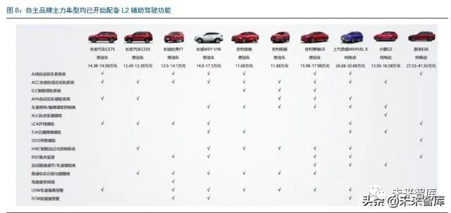 自主品牌主力车型已开始全面配置 L2 辅助驾驶功能。国内自主品牌已经在 10-15 万元 主力车型上加大 L2 级智能驾驶的装配率,包括 AEB、全速自适应巡航、APA 自动泊车 等。长城哈弗 F7、长安 CS75 PLUS、吉利缤越、缤瑞等都是目前的明星车型,智能化 配置也是这些车型的重要卖点。