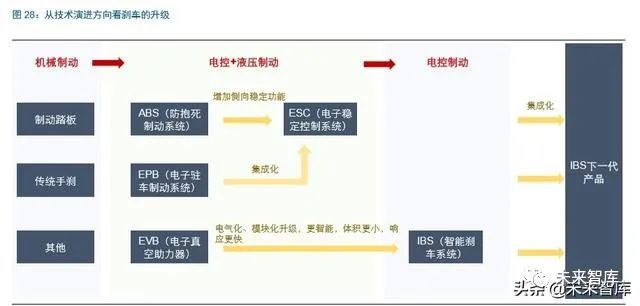 电控+液压制动是当期主流,未来将向线控制动升级。相较于下一阶段线控制动,电控+ 液压的方式是目前主流汽车采用的产品。汽车制动系统经过长期发展,已逐渐由传统液压/气压制动发展到目前电控+液压方式,主要包括制动防抱死系统(ABS)/电子稳定控 制系统(ESC)、电子驻车系统(EPB)等,未来向线控制动升级当中, IBS 是核心产品。