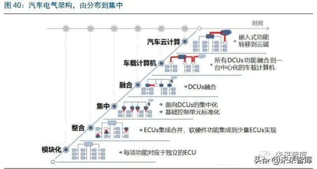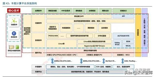 更高阶的智能汽车需要更强的全新的计算平台架构。1)硬件平台:域控制器整合 AI 单 元、控制器 MCU 等;2)系统软件:自动驾驶系统,包括内核软件等。3)功能软件:实 现视觉算法;4)应用软件:地图导航、决策规划等。