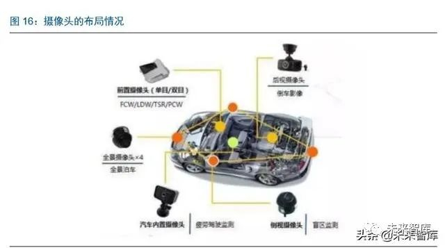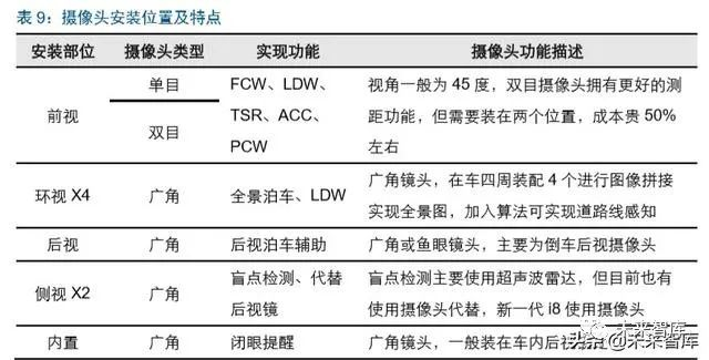 基于摄像头的视觉系统根据功能需求的不同,单车用量在 6 颗以上。车载摄像头通过图 像识别,可以做到对车道线、交通牌、行人的识别,而且成本相对较低,这是其他的传 感器无法比拟的。根据智能驾驶功能的需要,摄像头的安装位置也有不同。主要分为前 视、后视、侧视以及内置。L1、L2 级智能驾驶上,主要应用前视摄像头、环视摄像头以 及后视摄像头,单车用量 6 个摄像头,更高阶的智能驾驶还包括内置摄像头以及侧视摄 像头等,单车用量更高。