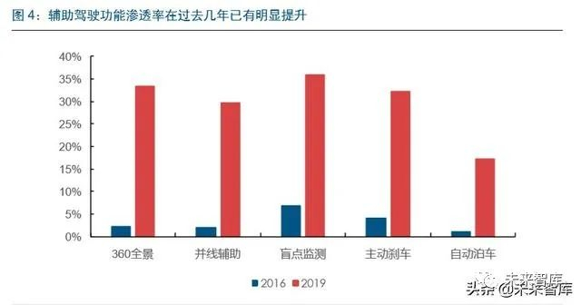 辅助驾驶(ADAS)的装配率在过去几年已有明显提升,但真正加速渗透才刚刚拉开序 幕。我们根据易车网的车型配置(配置车型数量/所有车型数量,与实际销量的渗透率仍 然有差异)测算,2016 年 360 全景、并线辅助、盲点监测、主动刹车、自动泊车的配 置率大概在 2%-5%,而 2019 年相关功能的配置率已经大幅提升到 25%-35%。但我们 认为目前渗透率的加速提升才刚刚开始,25%-35%的渗透率正是行业爆发前的临界点。