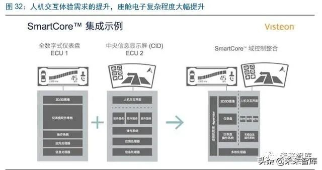 “一芯多屏”将是座舱电子趋势,对于车企降低成本和结构复杂度,对供应商来说龙头企 业有望以点带面进一步扩张。目前数字仪表、车载娱乐系统、HUD 等均采用独立的控制 器,这样一方面成本较高,另一方面在座舱电子信息交互越来越频繁下也加大了 ECU 之间联动的难度。“一芯多屏”通过采用一个控制器去管理座舱内部多个产品,是解决目 分布式产品痛点的有效方案。伟世通在 2015 年就推出 Smartcore 产品,并将在 2020 年在戴姆勒车型上实现量产。“一芯多屏”对于车企来说也进一步降低了采购面向多家 供应商的管理成本,也带来座舱电子龙头更强的以点带面提供拓展品类的能力。