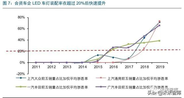 参考 LED 车灯渗透的历史,配置率超过 20%向中低端车型渗透时,配置率将加速提升。 以 LED 车灯配置率为例,合资车企在 LED 配置比例超过 20%后,配置率快速提升。背 后的核心原因是当一个配置从高价位向低价位下放时,销量占比较高的低价车型标配后 会带来渗透率的快速提升。