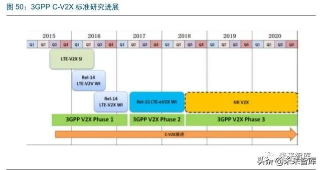 LTE-V2X 的标准已经与 2018 年 6 月落地,支持 5G-V2X 的标准目前仍在讨论中,有望 在 2020-2021 年落地。当前 C-V2X 的标准化分为三个阶段:1)支持 LTE-V2X 的 3GPP R14 版本表针已经正式发布;2)支持 LTE-V2X 增强的 3GPP R15 版本标准与 2018 年 6 月正式完成;3)支持 5G-V2X 的 3GPP R16+版本标准宣布在 2018 年 6 月启动研究, 将与 LTE-V2X 等形成互补关系。国内包括中国通信标准化协会(CCSA)、全国智能运 输系统标准化技术委员会(TC/ITS)、中国智能交通产业联盟(C-ITS)、车载信息服务 产业应用联盟(TIAA)、中国汽车工程学会(SAE-China)及中国智能网联汽车产业创新联盟(CAICV)等都已积极开展 C-V2X 相关研究及标准化工作,初步形成了覆盖 C-V2X 标 准协议等各层次、各层面的标准体系。