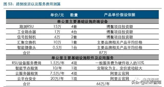 RSU 的投资预计将超过 800 亿以上空间。城市交通路口预计单个岔路口需要 2 个 RSU 的配置,考虑到交通路口上 RSU 需要处理更多的信息需求,对于 RSU 的处理能力要求 较高,单个价值预计为 15 万以上,整套系统预计单个路口投资接近 90 万。按照一个一 线城市 8000 万个路口,覆盖率达到 50%,单城市的平均投资 40 亿元;高速公路每公 里需要两个路测单元,RSU价格预计单个在1-2万元左右,单公里的投资预计20万元, 高速公路全覆盖的投资测算为 280 亿元,后续服务费用预计将产生每年 800 亿以上的 市场。