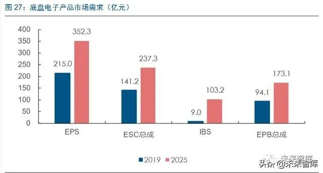 底盘执行机构电控化三大核心(EPS/ESC/IBS)在我国渗透率仍然较低,市场空间提升 潜力巨大。1)EPS:欧美 EPS 的渗透率已经在 80%以上,而国内渗透率约在 67%, 仍然有较大的提升空间,未来渗透率有望达到 90%以上;2)ESC:2011 年对海外部分 发达国家在新车加入了 ESC 强制渗透的要求,北美 ESC 渗透率超过 95%,欧洲也已 经超过 90%,但中国国内的 ESC 渗透率在 55%左右,2025 年有望提升至 80%左右;3) IBS 处于量产初期阶段,渗透率偏低,新能源乘用车搭载率 15%,传统燃油车 1%,未来新能源乘用车、传统燃油车搭载率分别有望提升至 40%、15%;4)EPB 目前市场 渗透率约 44%,未来有望提升至 70%以上;4)预计到 2025 年国内 EPS、ESC 总成、 IBS、EPB 总成市场规模分别为 352、237、103、173 亿元。