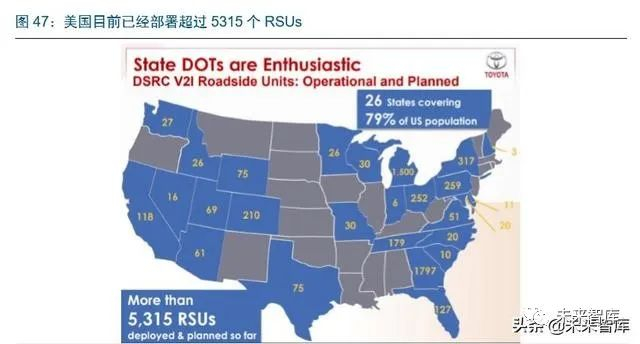 美国是目前推行 V2X 最为成熟的国家,目前 RSU 设备已经分布超过 26 个州。美国约 有 10000 个城镇、城市、县和州购买、运营和维护交通基础设施设备。联邦政府提供资 金,但不拥有任何基础设施。美国共有35万个交叉口,大约部署约5315套DSRC RSU, 分布在 26 个州,覆盖超过美国 50%的州,总共大约 18000 套车载终端 OBU(包括前 装设备和后装设备)。