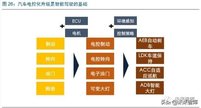 底盘的电控化升级主要是满足智能驾驶线控的要求以及在电动化中能量回收的效率提 升。执行机构从机械结构向电子化结构的升级主要加入了传感器、驱动电机以及控制器 等电子元件。除了自身结构电子化升级,执行机构的控制算法也极为关键。以 ESC 为 例,需要计算汽车侧向力、纵向力等综合实现对刹车动作的调整,这需要大量的路试和 算法优化,这带来了产品的软件高附加值。