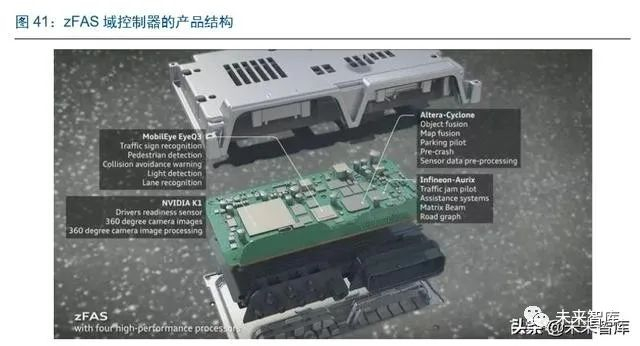 zFAS 是全球首个量产的域控制器,将 ADAS 的所有子域都集中到一个计算平台上。从 奥迪公布的资料来看,zFAS 有 4 个核心元件:Mobileye 的 EyeQ3,主要负责交通信号 识别、行人检测、碰撞报警、光线探测和车道线识别;英特尔(Altera)的 Cyclone V 负 责目标识别融合,地图融合,自动泊车,预刹车,激光雷达传感器数据处理;英飞凌的 Aurix TC297T 负责监测辅助驾驶系统运行状态及各 ECU 之间的通信,同时还负责矩阵 大灯;而英伟达的 Tegra K1 负责驾驶员状态检测,360 度全景及所有与图像相关的计 算。