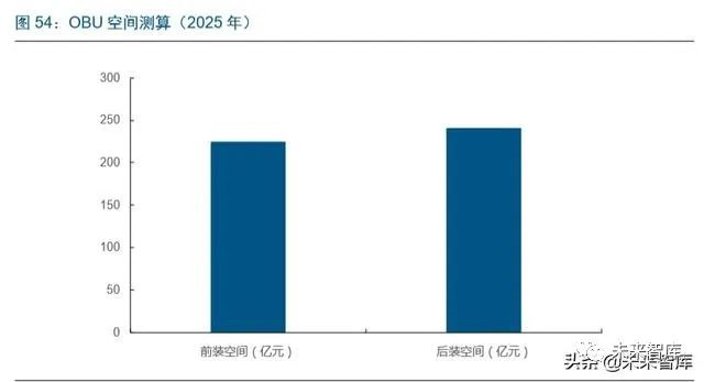 随着基建覆盖逐步完善,前装的配置以及后装 OBU 的配置将加大,OBU 设备空间超过 400 亿以上。OBU 市场预计在车载 OBU 可以分为前装和后装的产品,预计前装价格为 800 元,后装价格为 1000 元。V2X 前装配置的时间依赖后续的政策规划,V2X 必须具 备较高的车辆覆盖率才能发挥效果。假设 2025 年汽车销量 2800 万辆(包含商用车), 安装渗透率 100%的配置将带来前装市场需求 224 亿,后装保有量 2.4 万辆,按照 10% 的装配率测算,预计空间为 240 亿。